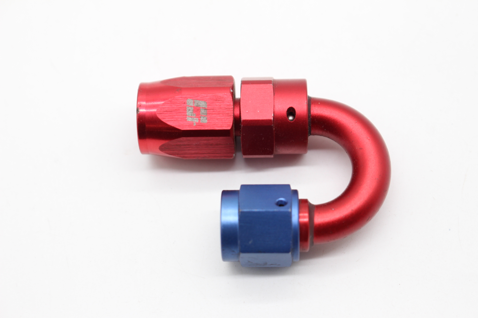 Gebrauchter ALU-Fitting 180° – Dash 6 / AN6 / JIC6 – Blau/Rot eloxiert