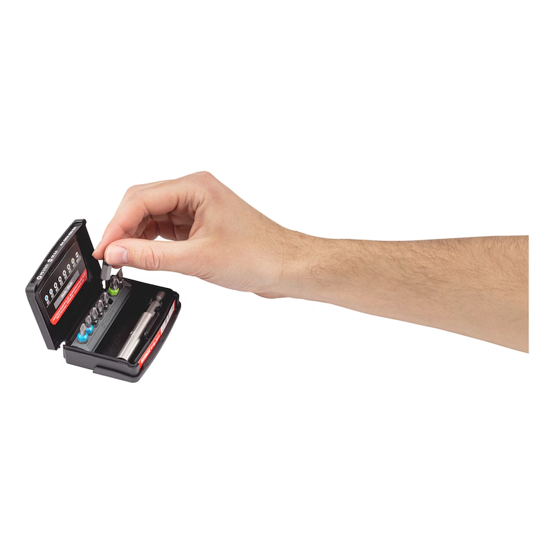 Die Würth Bitbox Größe 1 ist ein kompakt bestücktes Bitsortiment mit PZ und Schlitz Abtrieb inklusive magnetischem Bithalter. Sie eignet sich ideal für Montageeinsätze, Servicearbeiten und den mobilen Einsatz. Dank des integrierten Bitriegels richtet sich dieser beim Öffnen der Box automatisch auf und ermöglicht eine schnelle und komfortable Entnahme der Bits.
