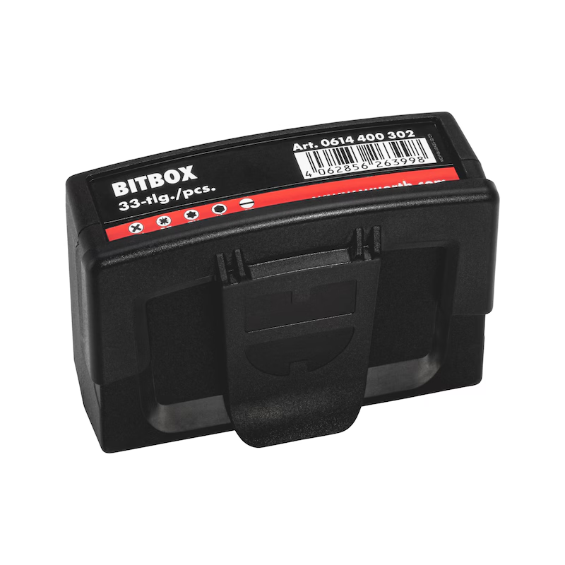 Die Würth Bitbox Größe 3 ist ein umfangreich bestücktes Profi Bit Sortiment für Montage Werkstatt und Service. Das Set enthält 33 Bits mit den gängigen Abtriebsarten PH PZ TX Innensechskant und Schlitz sowie einen magnetischen Universalhalter.