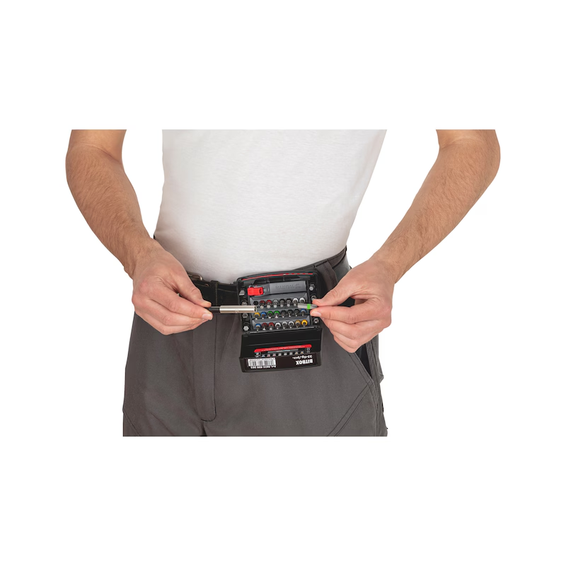 Die Bits sind in austauschbaren Bitriegeln untergebracht und können zur Mitnahme oder individuellen Bestückung einfach aus der Box entnommen werden. Durch das Farbleitsystem im Deckel und auf den Bits ist die gewünschte Größe schnell erkennbar. Die kompakte Bauform und der praktische Clip ermöglichen den mobilen Einsatz am Gürtel oder die Integration in das ORSY System von Würth.