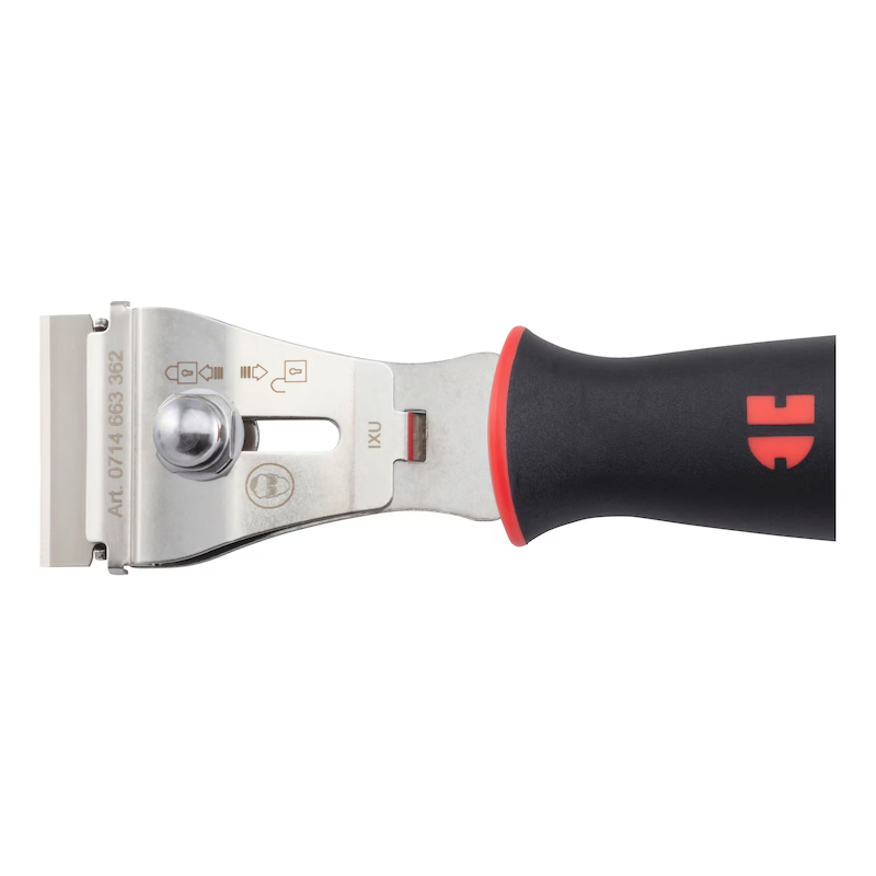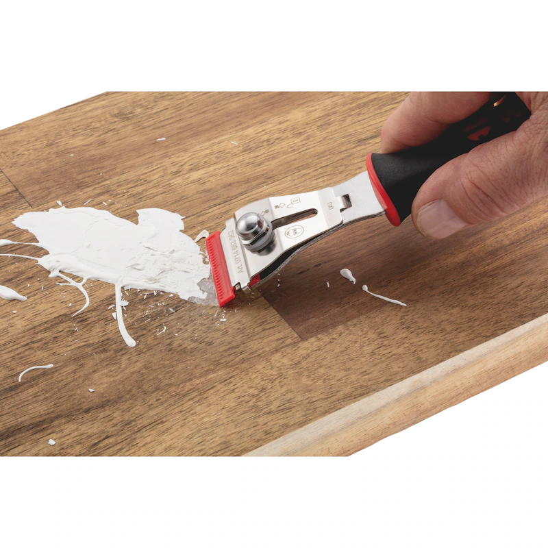 Durch die Kombination aus Metall- und Kunststoffklingen eignet sich der Schaber für empfindliche wie auch harte Oberflächen.