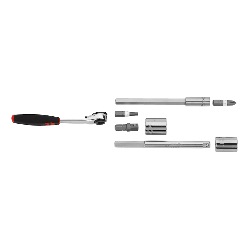 Die sehr flache und kompakte Bit-Knarre ermöglicht Arbeiten auch bei wenig Platz. In Kombination mit Verlängerung und Bithalter lassen sich selbst schwer erreichbare Schraubstellen problemlos bearbeiten. Die Umschaltung zwischen Rechts- und Linkslauf erfolgt bequem per Hebel, zusätzlich erlaubt das Rändelrad schnelles Andrehen von Schrauben per Hand.