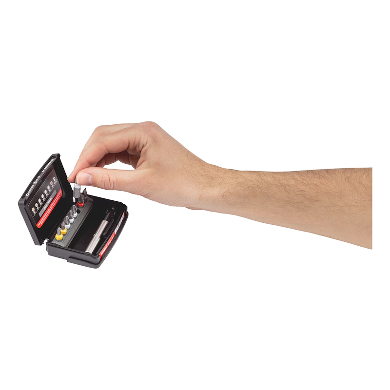 Der fest integrierte Bitriegel richtet sich beim Öffnen automatisch auf und ermöglicht einen schnellen, sicheren Zugriff auf alle Bits. Dank fester Klemmung sitzen die Bits sicher und lassen sich dennoch komfortabel entnehmen. Das Würth-Farbleitsystem erleichtert die sofortige Identifikation der passenden Bitgröße.
