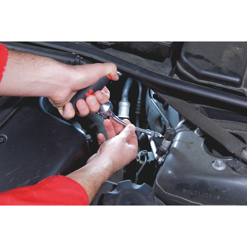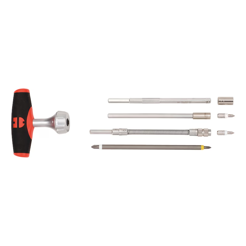 Der Schraubendreher kann als klassischer T Griff, als leistungsstarker Ratschenschraubendreher sowie mit Umsteck und Adapterklingen oder Steckschlüsseleinsätzen verwendet werden. Damit vereint das Set mehrere Werkzeuge in einem System und deckt eine Vielzahl von Anwendungen ab. Die Ratsche ist sehr robust ausgeführt und erlaubt ein maximales Drehmoment von bis zu 40 Nm.